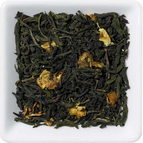 Flavoured black tea and green tea with touch of bergamot and vanilla bit. Black tea, green tea, flavour, tea blossoms, vanilla bits.