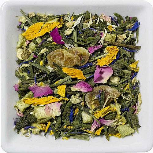 Green tea, ginger, apple bits, tanerine bits, lemongrass,