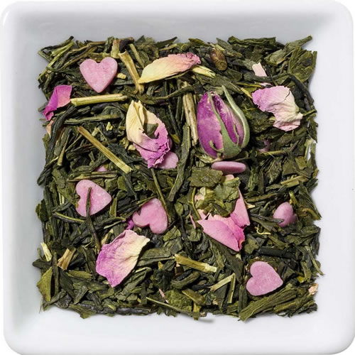 Green tea (87%), naturally coloured sugarhearts (8%), rose petals, natural flavour, rose buds. May contain traces of other nuts.