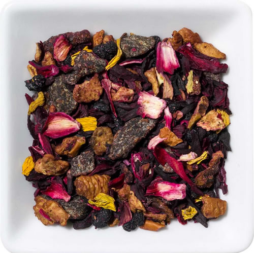 Peach, cream taste with Peach bits w/separating agent rice flour (34%), hibiscus, apple bits, elderberries, flavour, sunflower petals.
