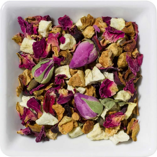 Fragrant of rose blossoms and sweet flavor of grapes. Apple bits, hibiscus, rose petals (5%), rose buds (2%), flavour.