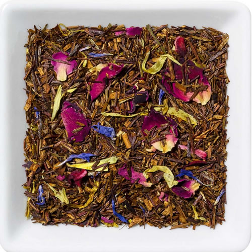 Mango/passion fruit taste with Rooibos, flavour, hibiscus, rose petals, marigold petals, cornflower petals.